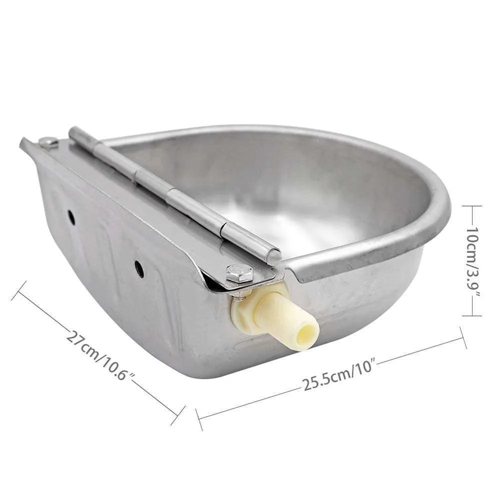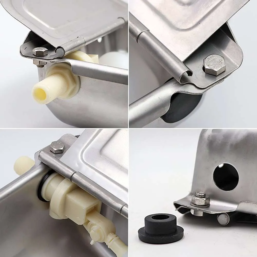 Abbeveratoio a galleggiante in acciaio. Dimensioni 26x26x11 cm. Attacco acqua da 1/2″ sia da destra che da sinistra. Coperchio ribaltabile. Capacità max 2,5 litri.