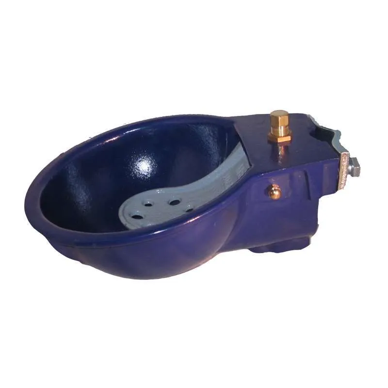 Abbeveratoio automatico in ghisa per bovini ed equini, fissaggio a tubo. Attacco acqua dal basso. Trattato contro la corrosione. Colore blu.