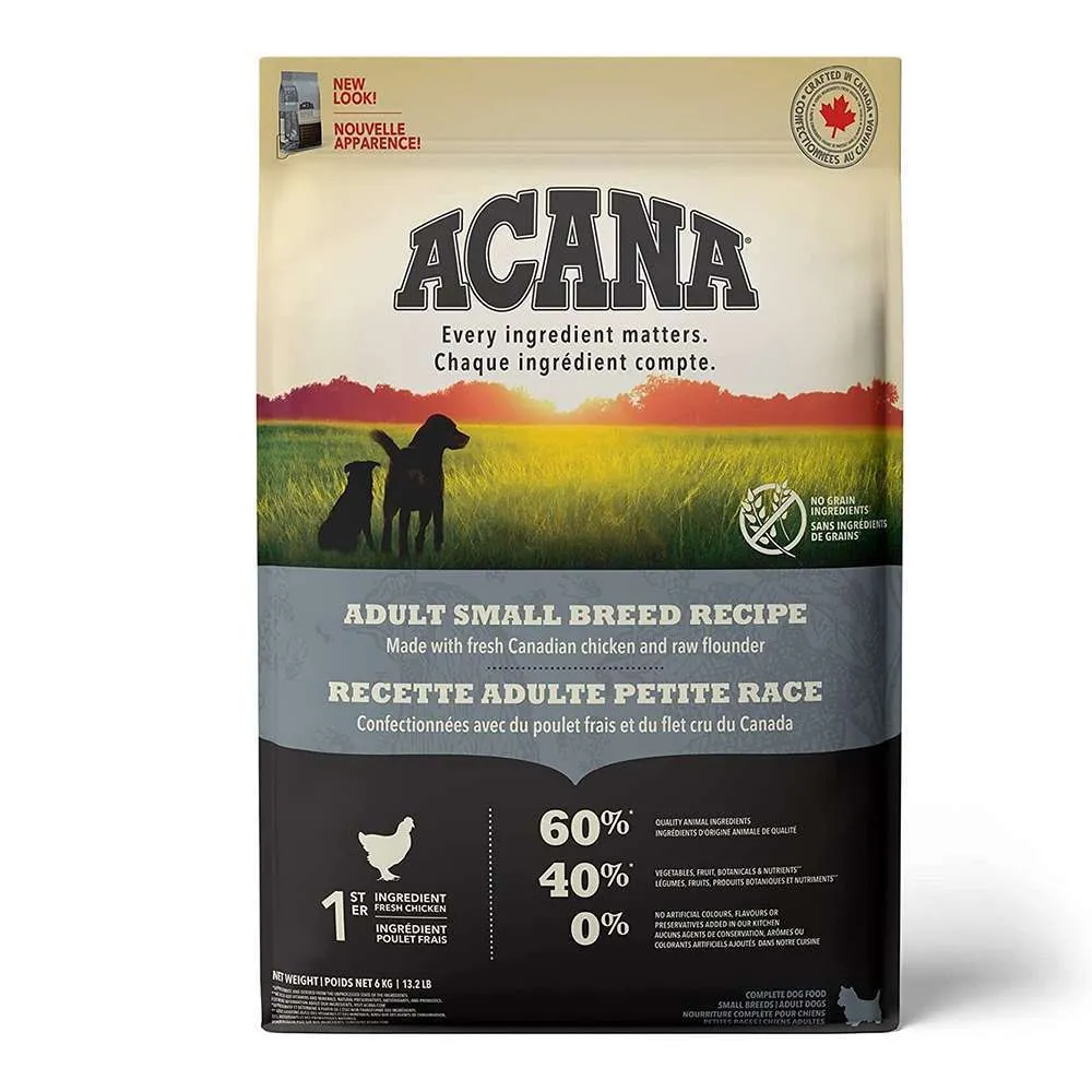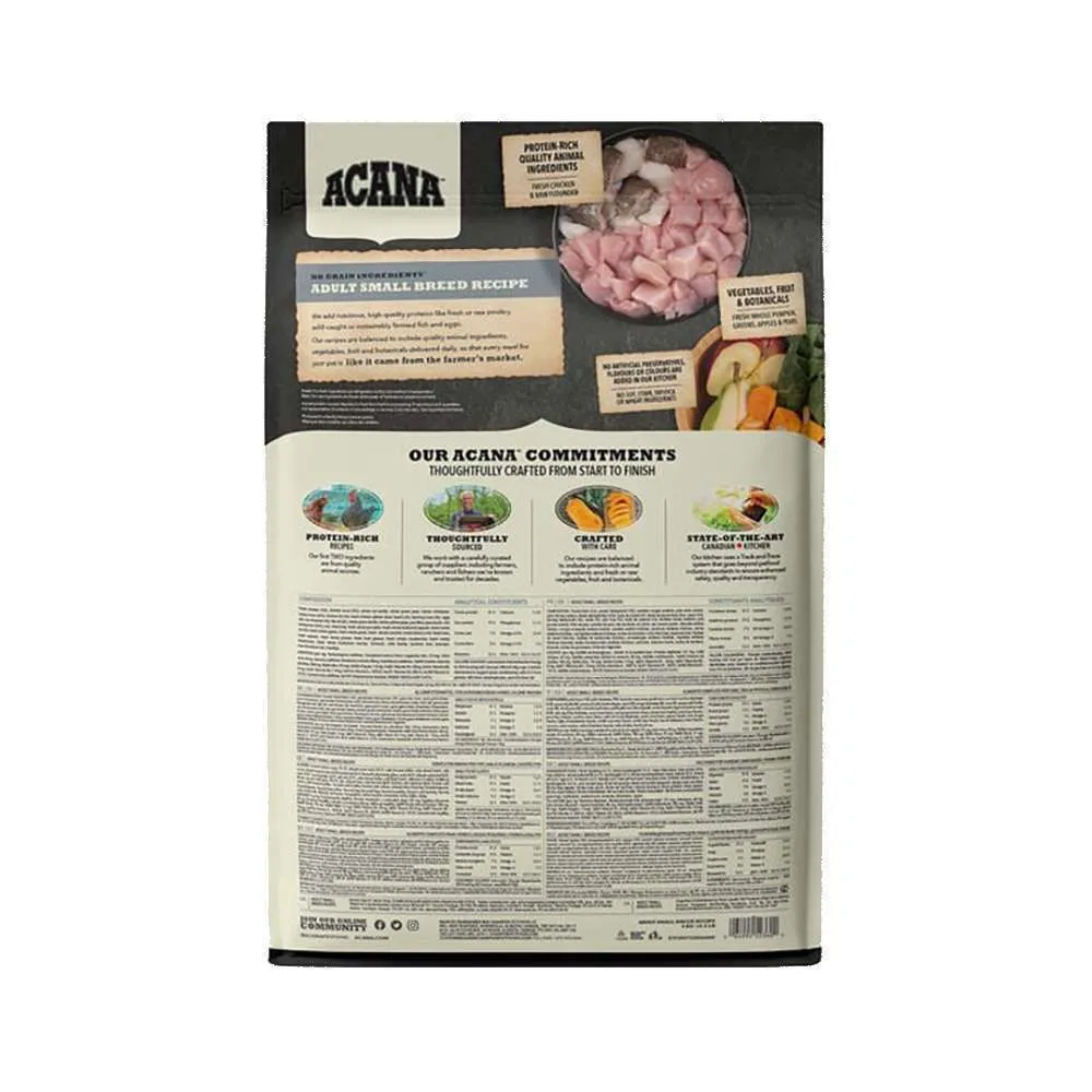 Acana Dog adult small breed Recipe include pollo, passera del Pacifico pescata in natura e uova, consegnati ogni giorno freschi o crudi fornendo in modo naturale tutti i nutrienti necessari per mantenere il cane forte e in salute.