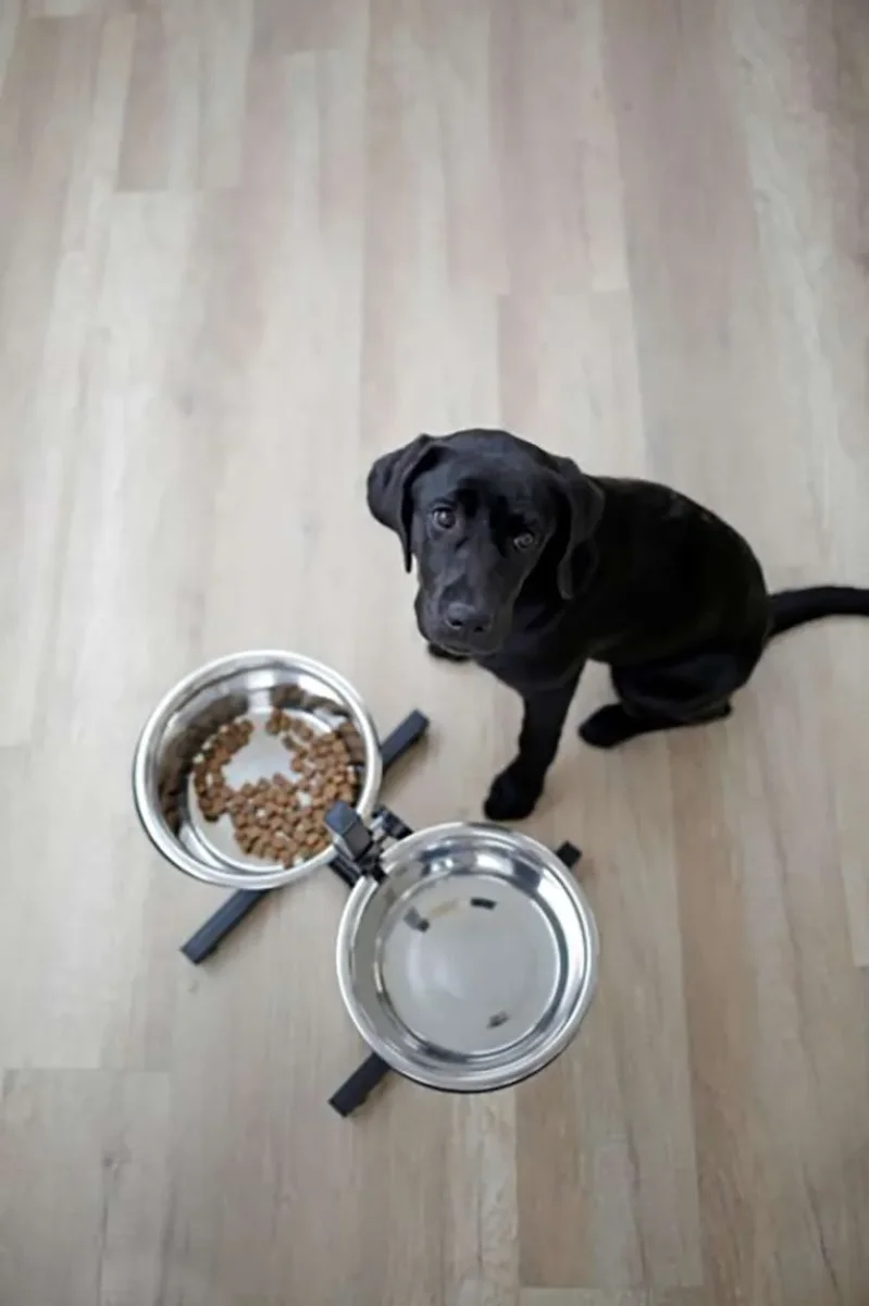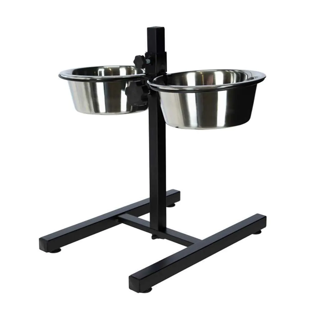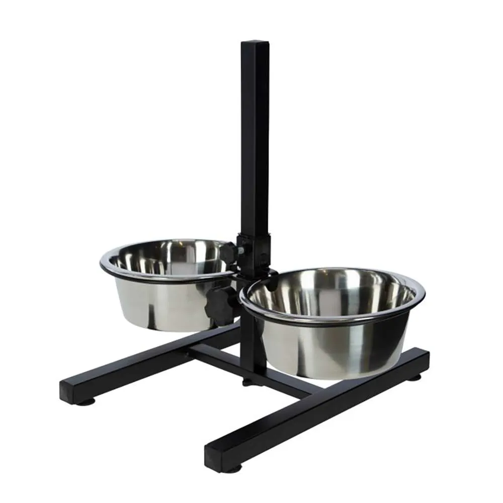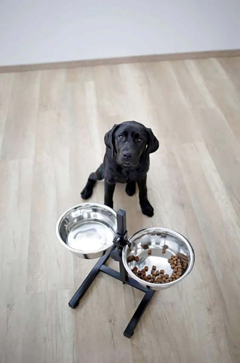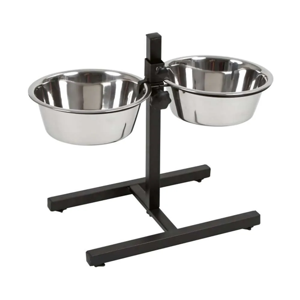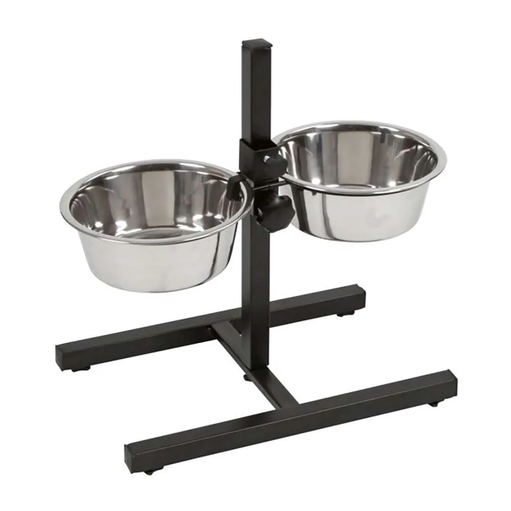 Ciotola doppia in acciaio inox con supporto regolabile in altezza.