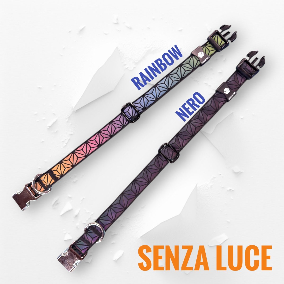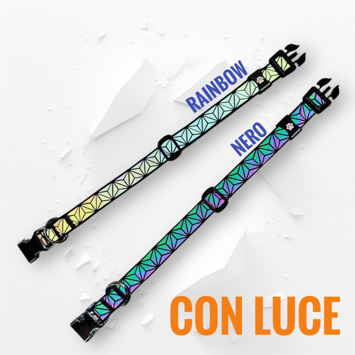 Realizzati artigianalmente con materiali tecnici ad alta visibilitร , questi collari offrono due varianti estetiche, entrambe sorprendenti sotto la luce, anche di giorno!