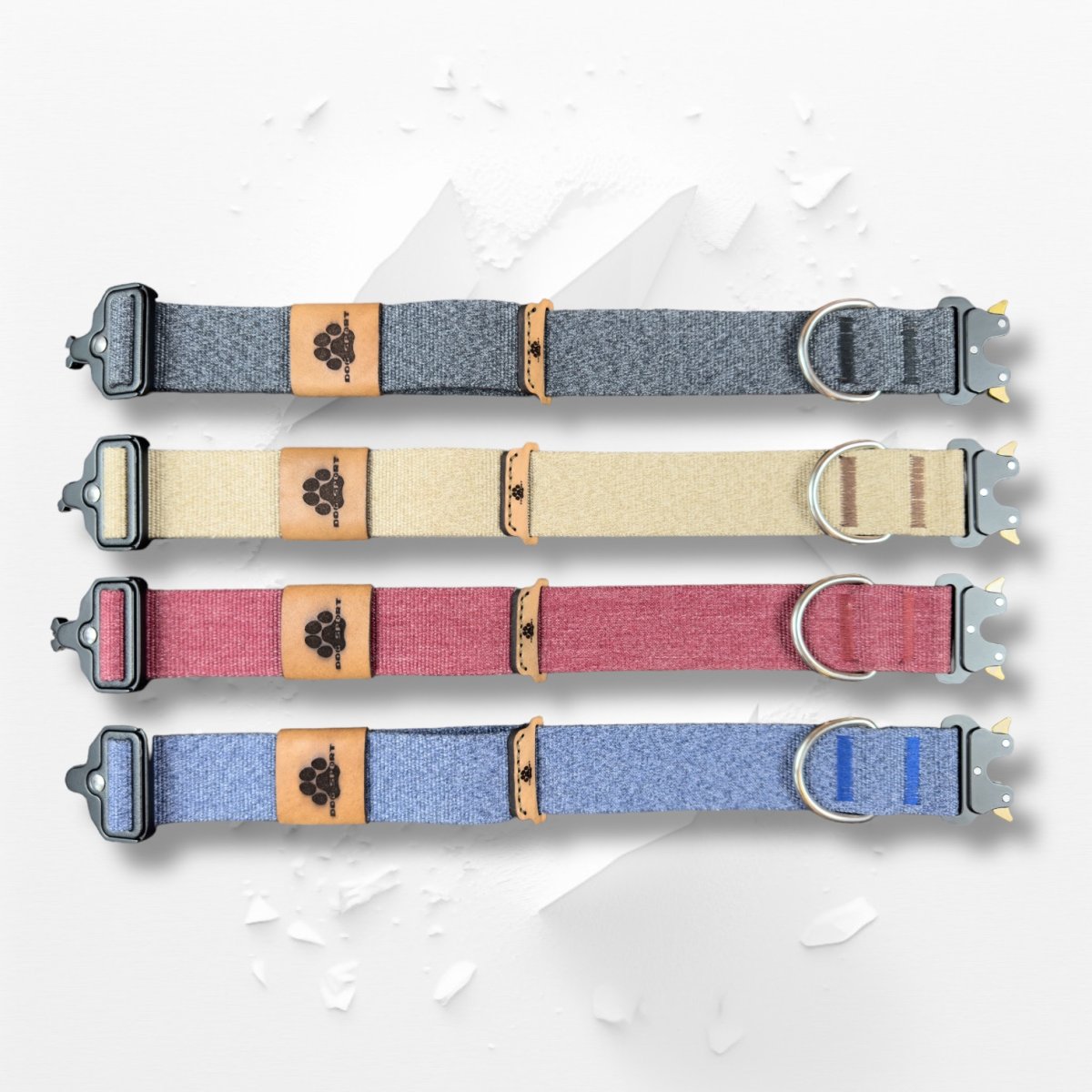 Collare City Fascia 4 cm Collare in tela misto poliestere/cotone con fascia da 4 cm. La finitura è più sobria rispetto ai modelli sportivi — pensato per chi vuole un collare artigianale anche per l’uso quotidiano in città. Larghezza: 4 cm Materiale: tela misto poliestere/cotone Moschettone e fibbia: alluminio Anello D: acciaio inox Personalizzazione nome disponibile Il misto poliestere/cotone è resistente e morbido al tatto. Personalizzazione con nome del cane disponibile su richiesta.