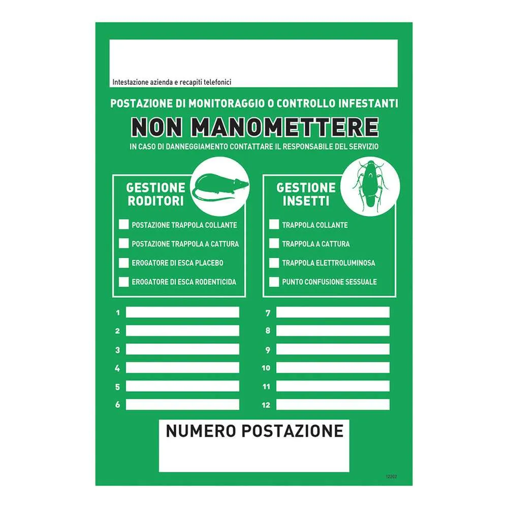 - cartelli segnalatori con strato adesivo posto sul retro per i servizi di derattizzazione e monitoraggio roditori e di monitoraggio insetti striscianti;