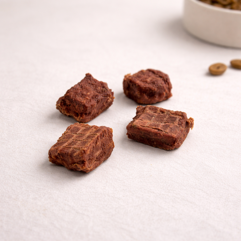 Si tratta di cubetti molto regolari, di circa 3 × 1,5 cm, ottenuti per essiccazione. Sono croccanti, ma non eccessivamente duri: non si rompono facilmente a mano e sono pensati per essere lavorati direttamente dal cane.