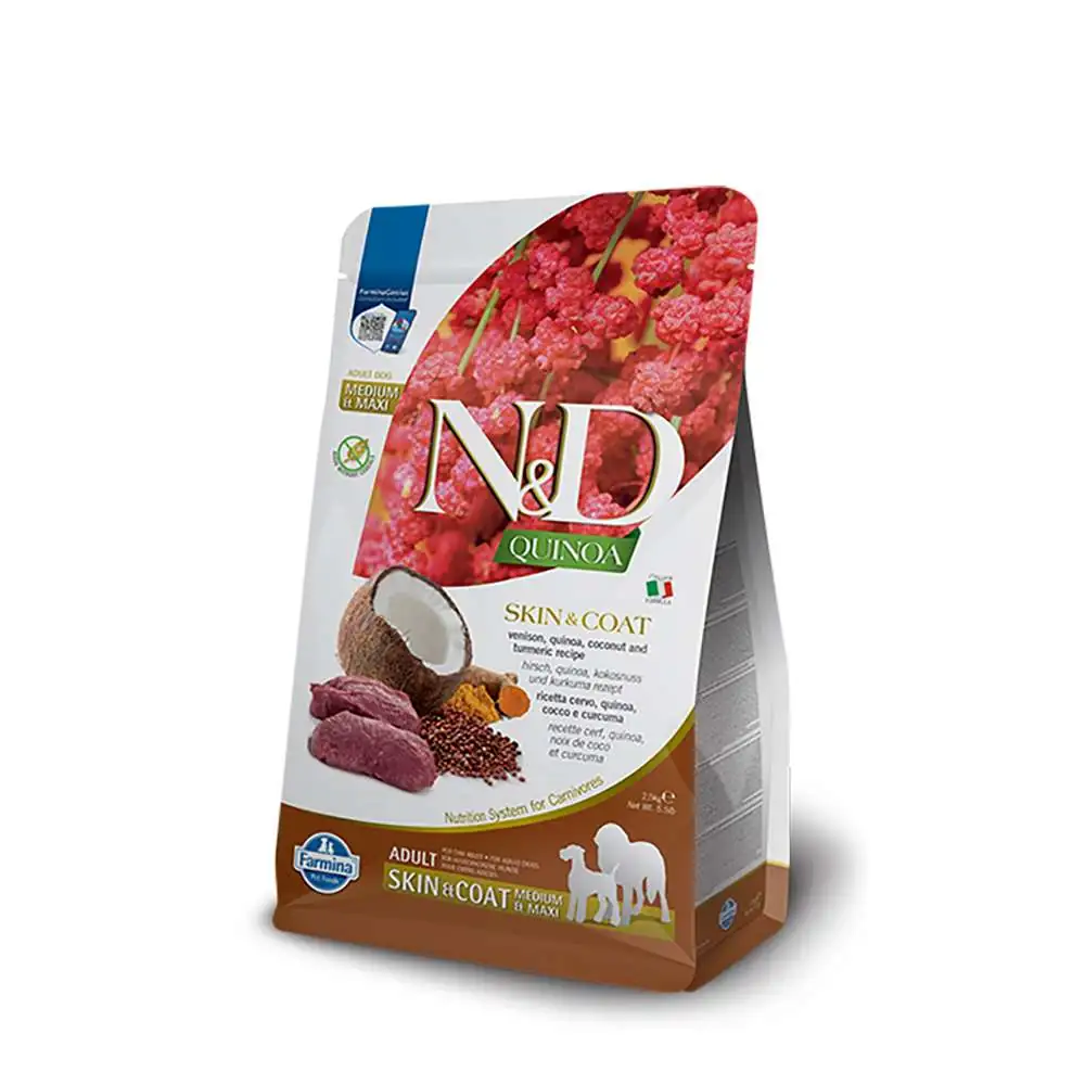 Farmina N&D quinoa cane skin&coat adult medium maxi cervo è un alimento dietetico completo per cani, consigliato per la riduzione di intolleranze a ingredienti e sostanze nutritive.