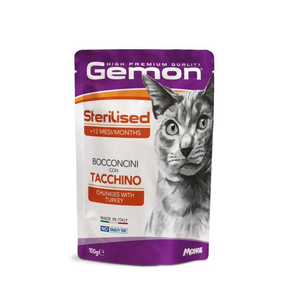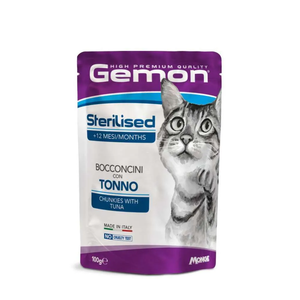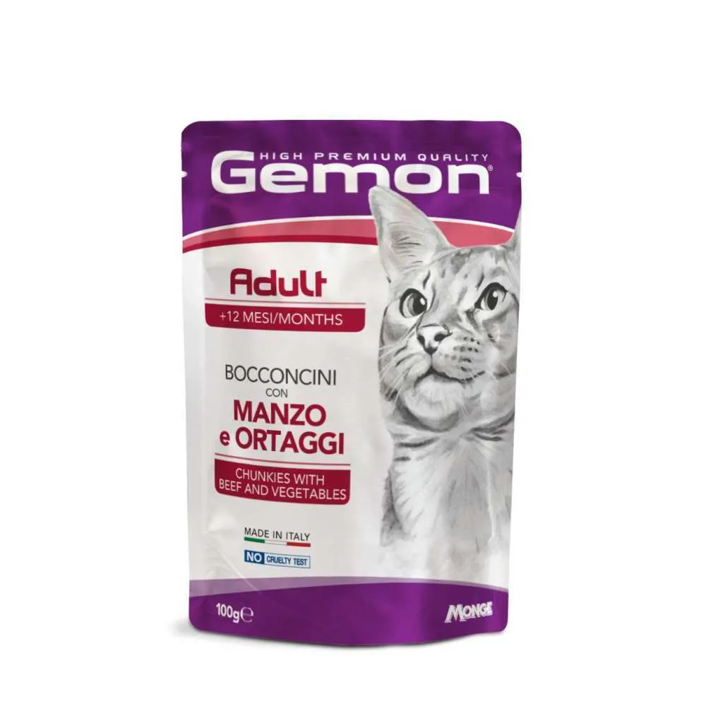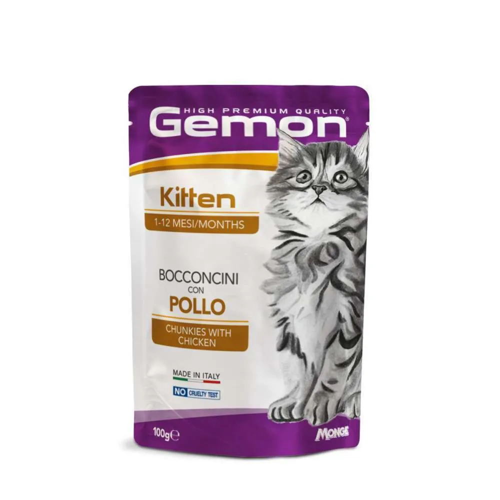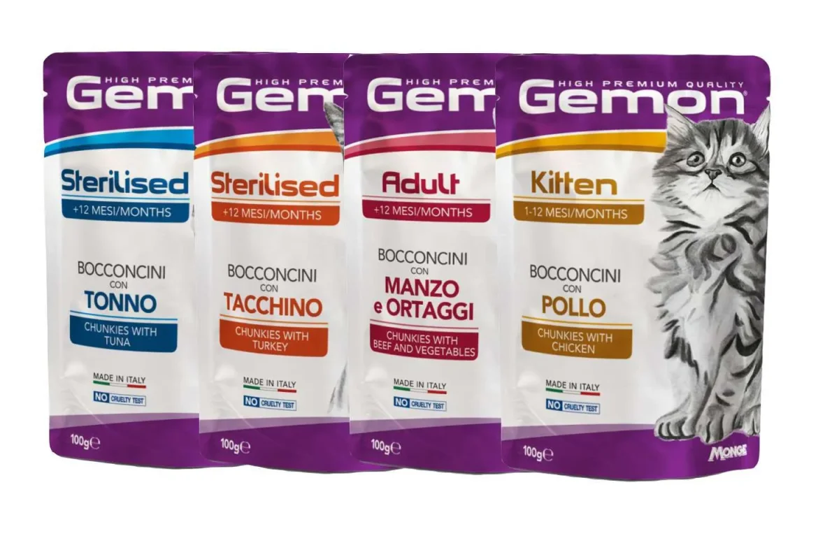 Gemon gatto bocconcini in bustina da 100 gr è un alimento completo per gattini o gatti adulti e sterilizzati disponibile in 4 referenze