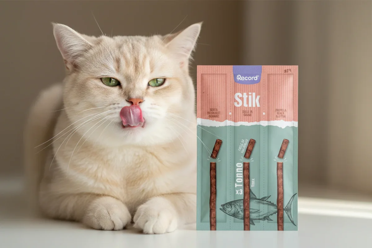 Gustoso snack per gatti “Stik” ad alto contenuto di carne, 6g, Tonno o Pollo, Record