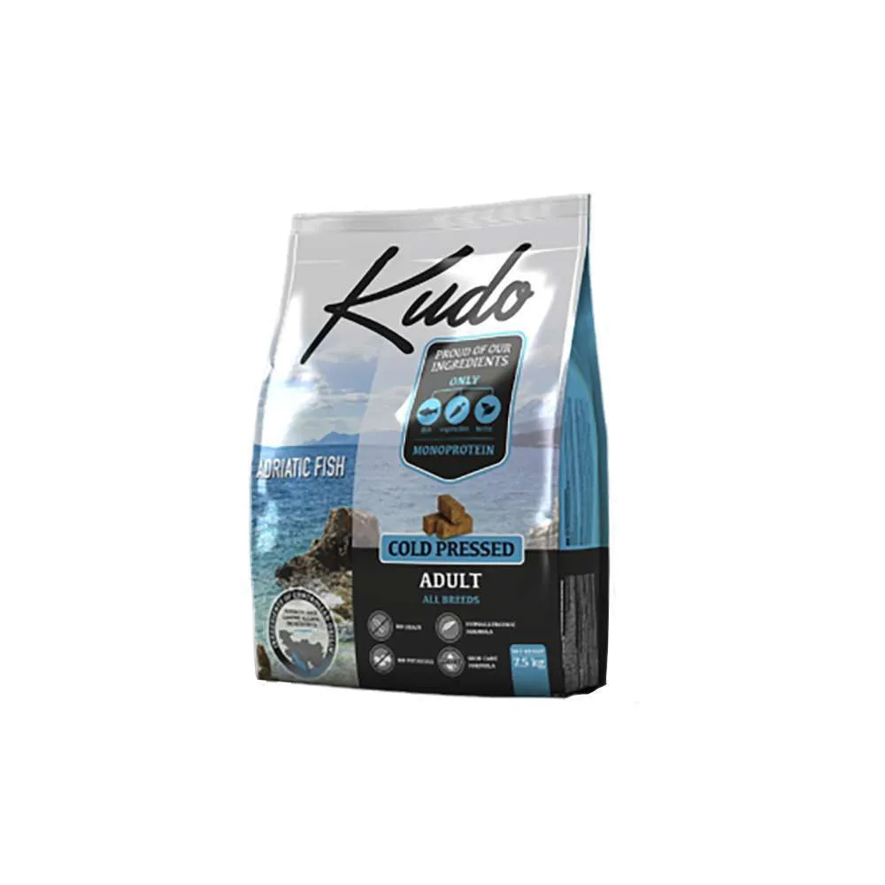KUDO ADRIATIC FISH è un pasto perfettamente equilibrato in accordo con i requisiti nutrizionali di tutte le taglie di cani adulti. E’ ricco di pesce e pieno di nutrienti verdure ed erbe salutari che assicureranno una buona vivacità e salute del vostro cane. E’ facile da digerire grazie alla pressione a freddo che mantiene le naturali proprietà organolettiche degli ingredienti. Usato unicamente pesce pescato dal mare Adriatico. L’alto contenuto di olio di pesce fornisce acidi grassi Omega-3 e Omega-6 per un supporto ottimale alla pelle e al pelo.Tutti gli ingredienti sono naturali, senza coloranti aggiuntivi, aromi o esaltatori di sapidità. La formula monoproteica è una scelta eccellente per i cani sensibili che tendono ad avere allergie. Prodotto senza patate o tapioca – basso indice glicemico, migliore digestione e meno allergie. I beta-glucani del lievito di birra secco e della radice di cicoria stimolano le naturali difese immunitarie. Questa ricetta contiene inoltre la zucca per migliorare la digestione.