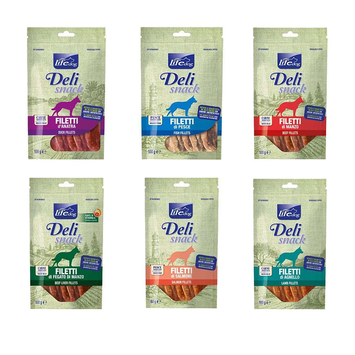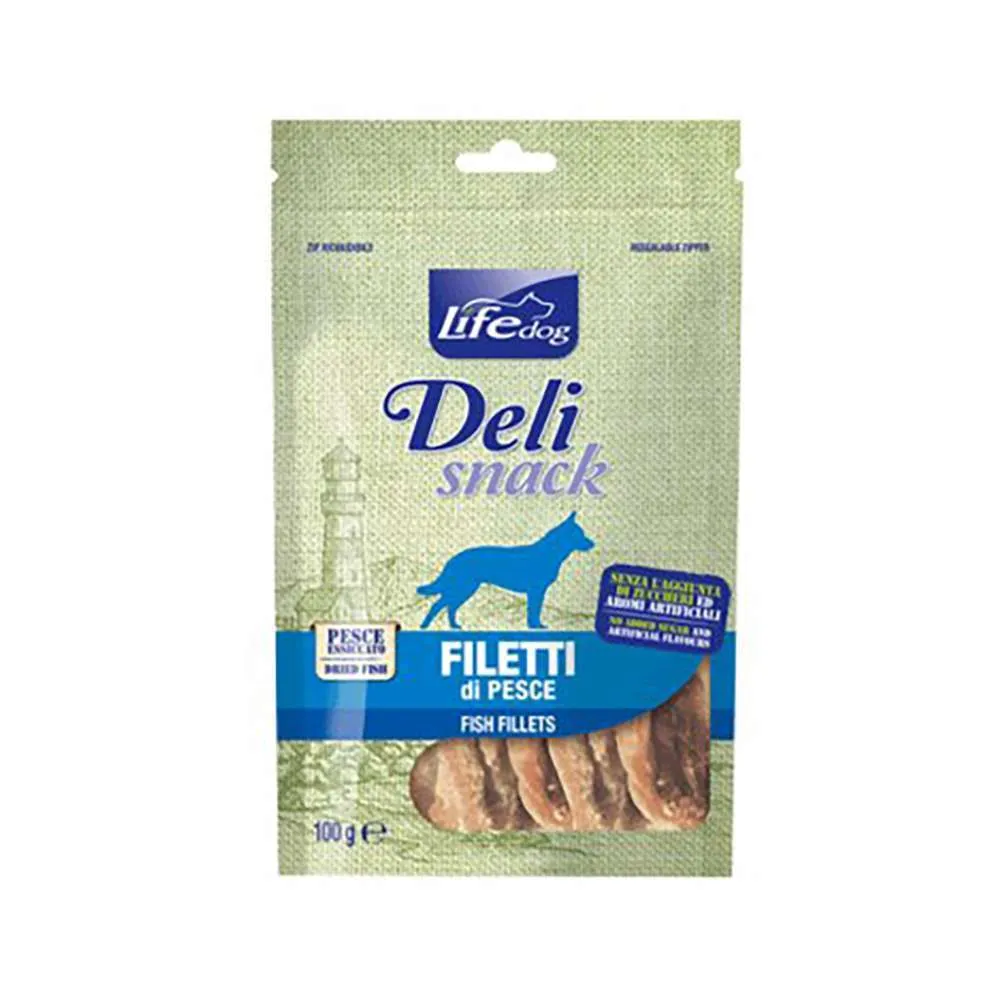 Life dog snack filetti di carne o pesce da 100 gr sono uno snack ricompensa per cani composta da carne essiccata senza zuccheri aggiunti