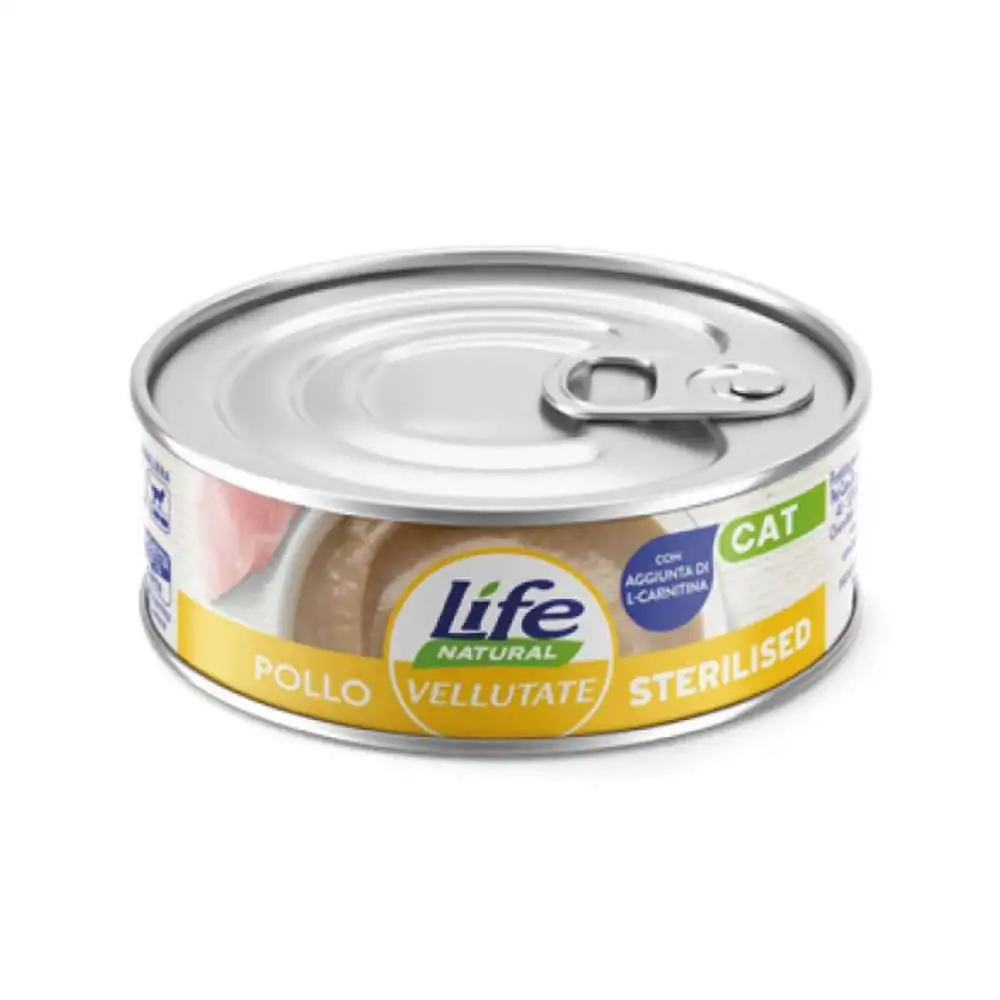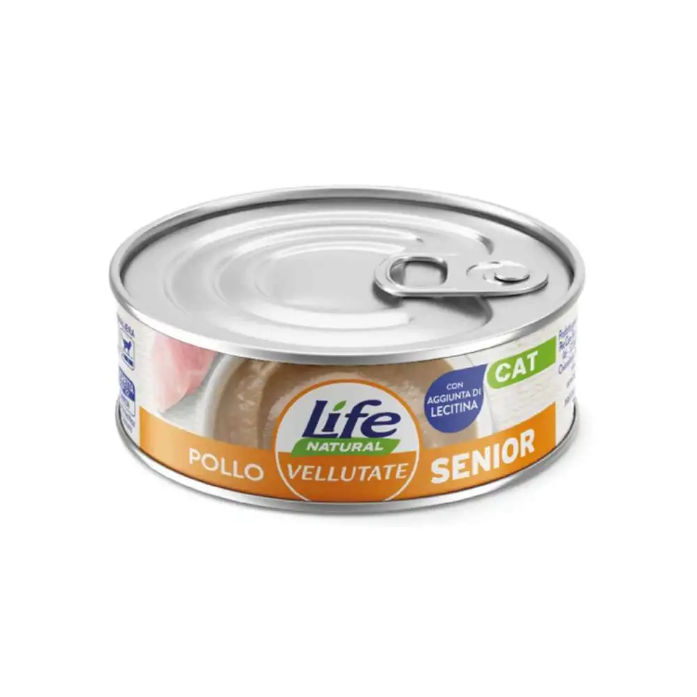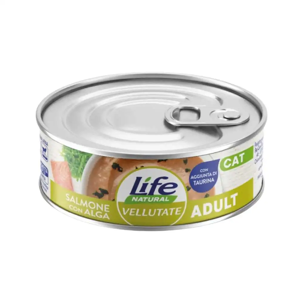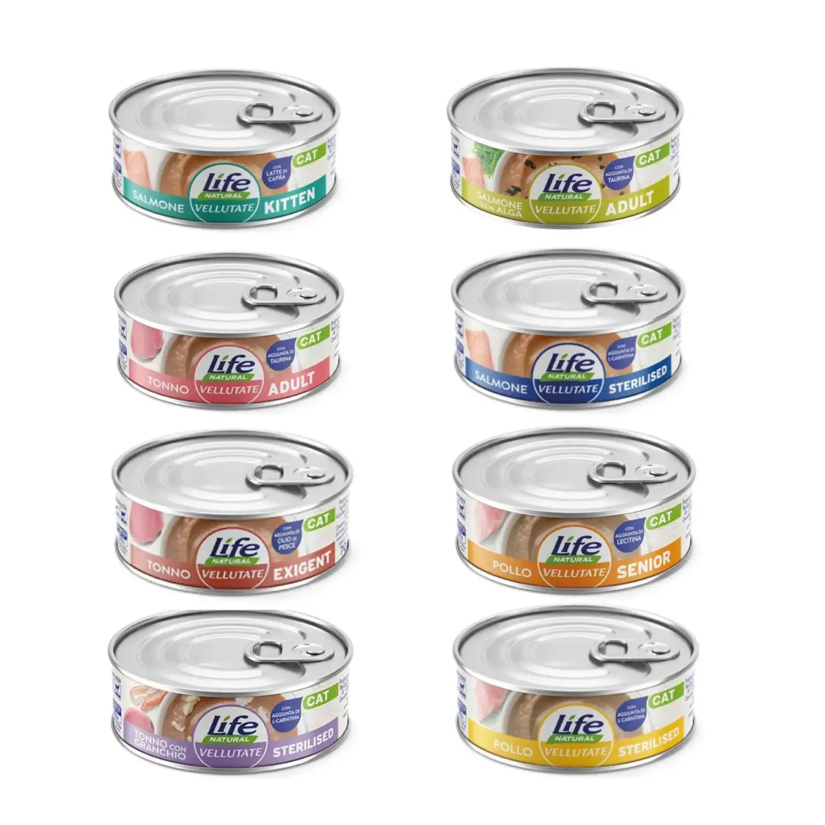 Life gatto Vellutate 70 gr in lattina disponibile nelle referenze: kitten con salmone, adult tonno, adult salmone, sterilizzato pollo, sterilizzato tonno con granchio, sterilizzato salmone, senior pollo e exigent con tonno