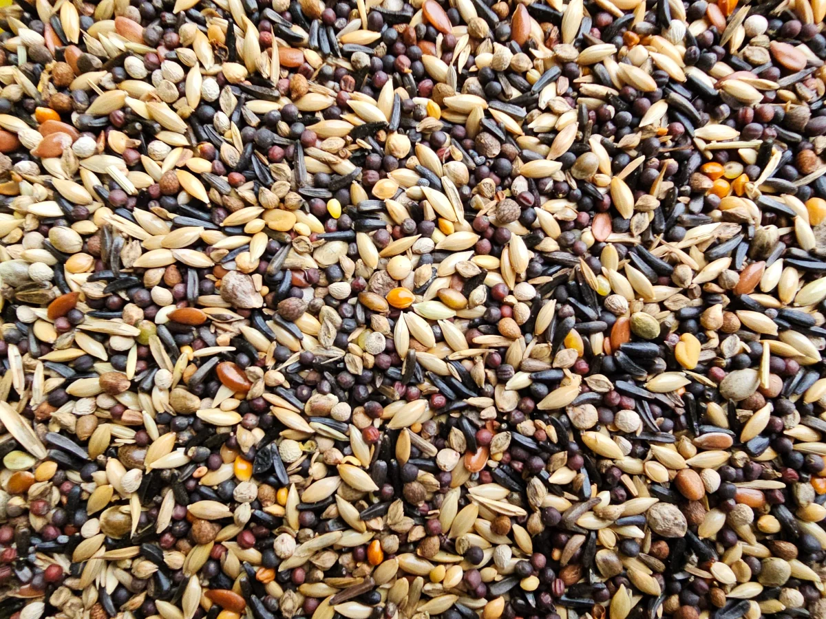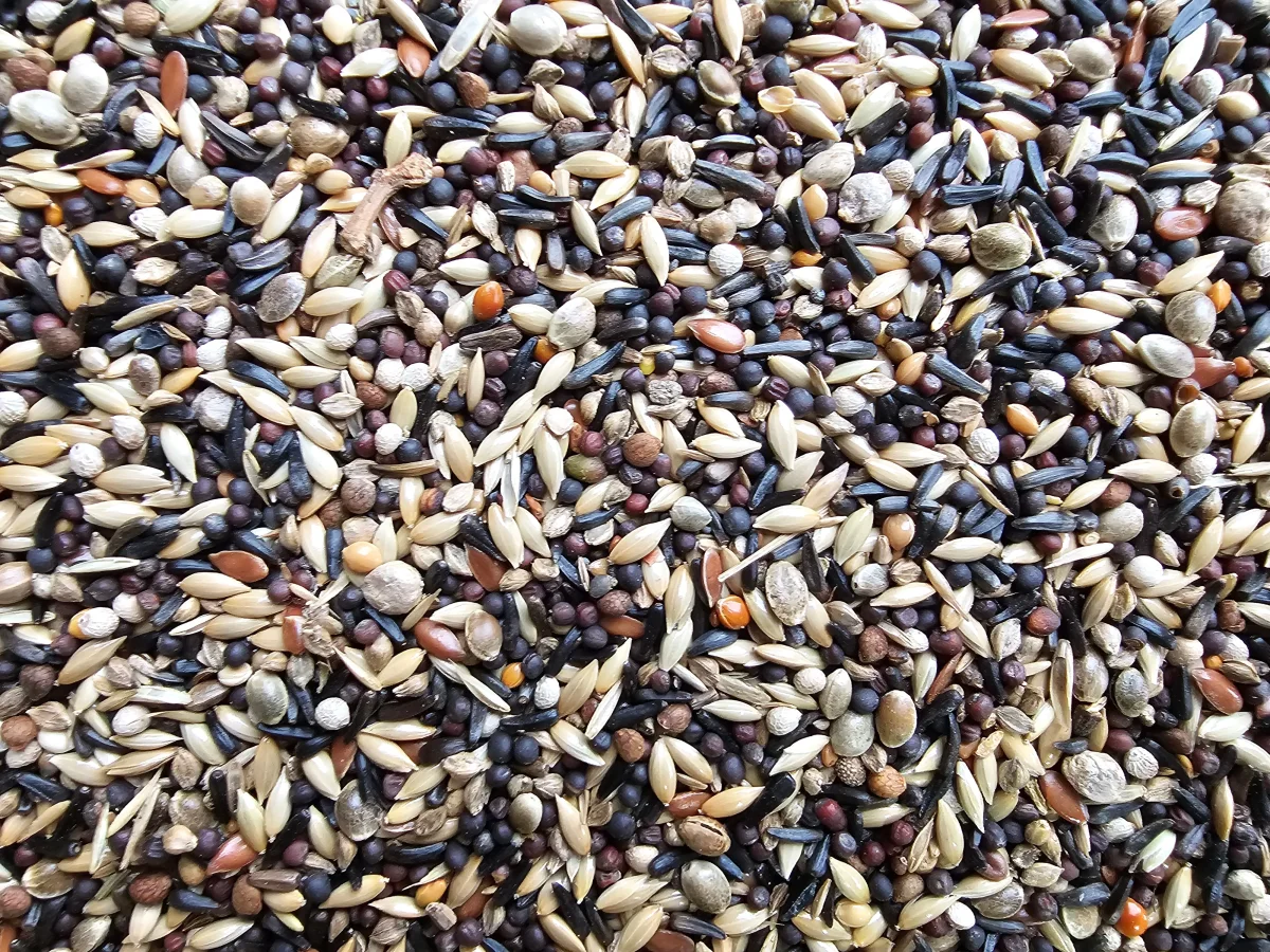 Scagliola piatta, colza, avena decorticata, semi di lino, semi di canapa, semi di negro, perilla bianca, semi di colza, semi selvatici, semi di papavero blu, cicoria