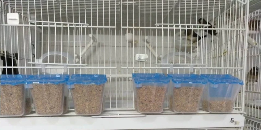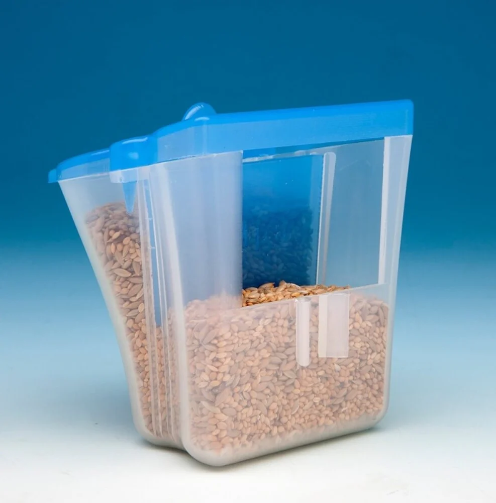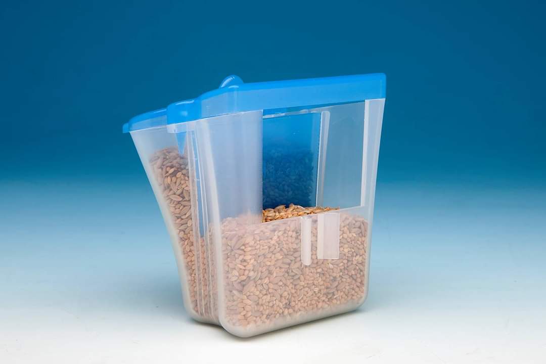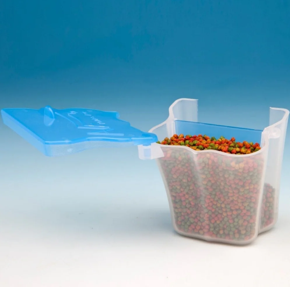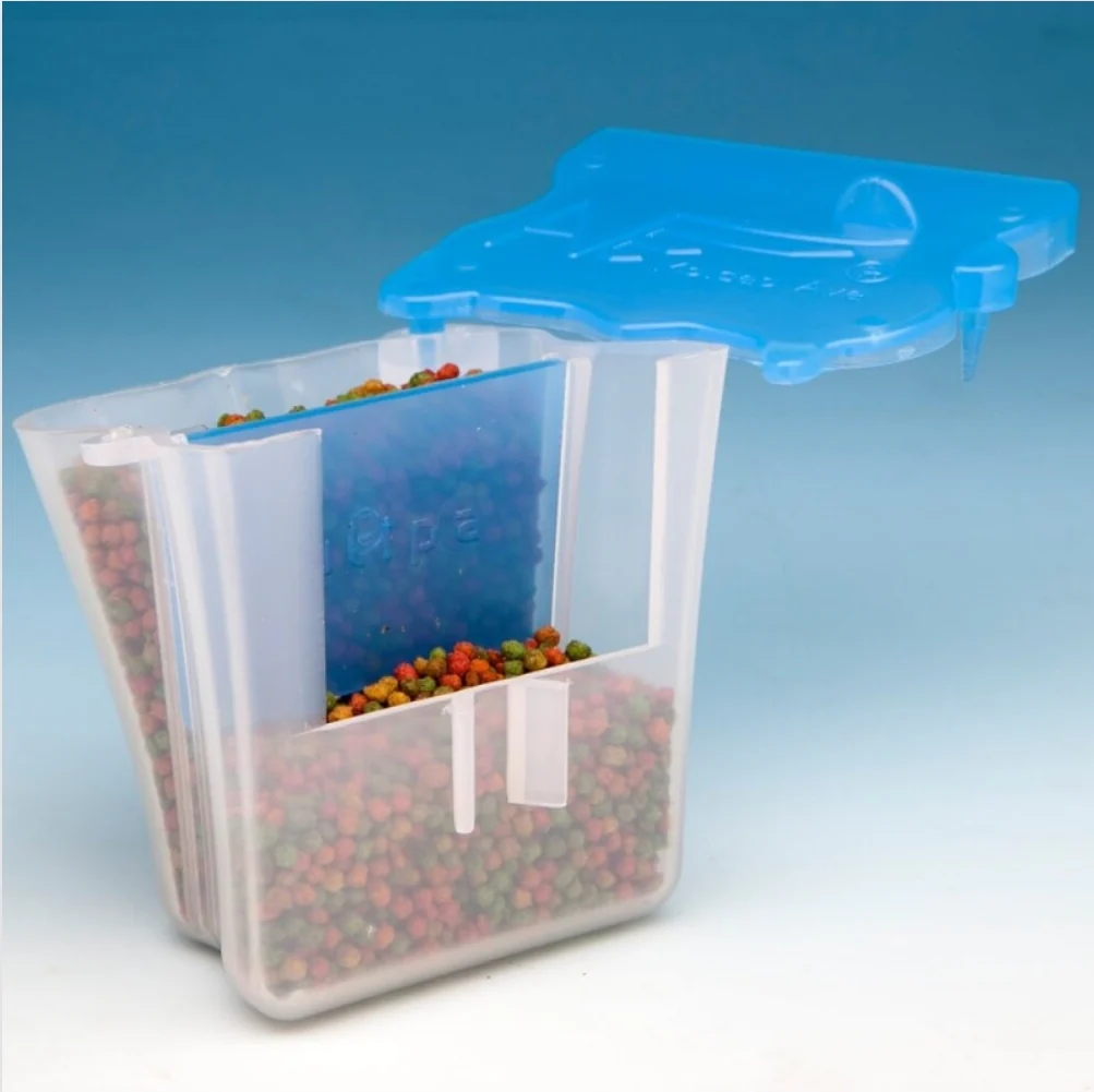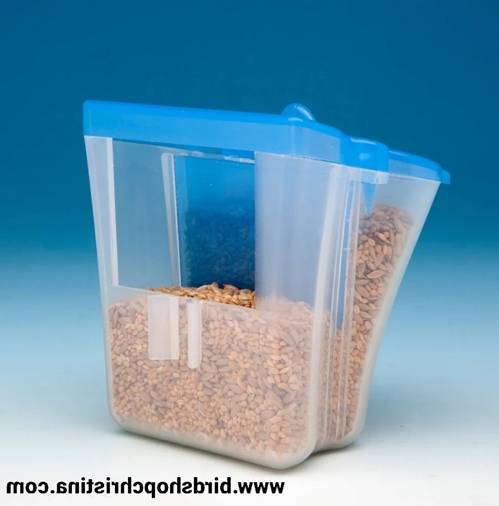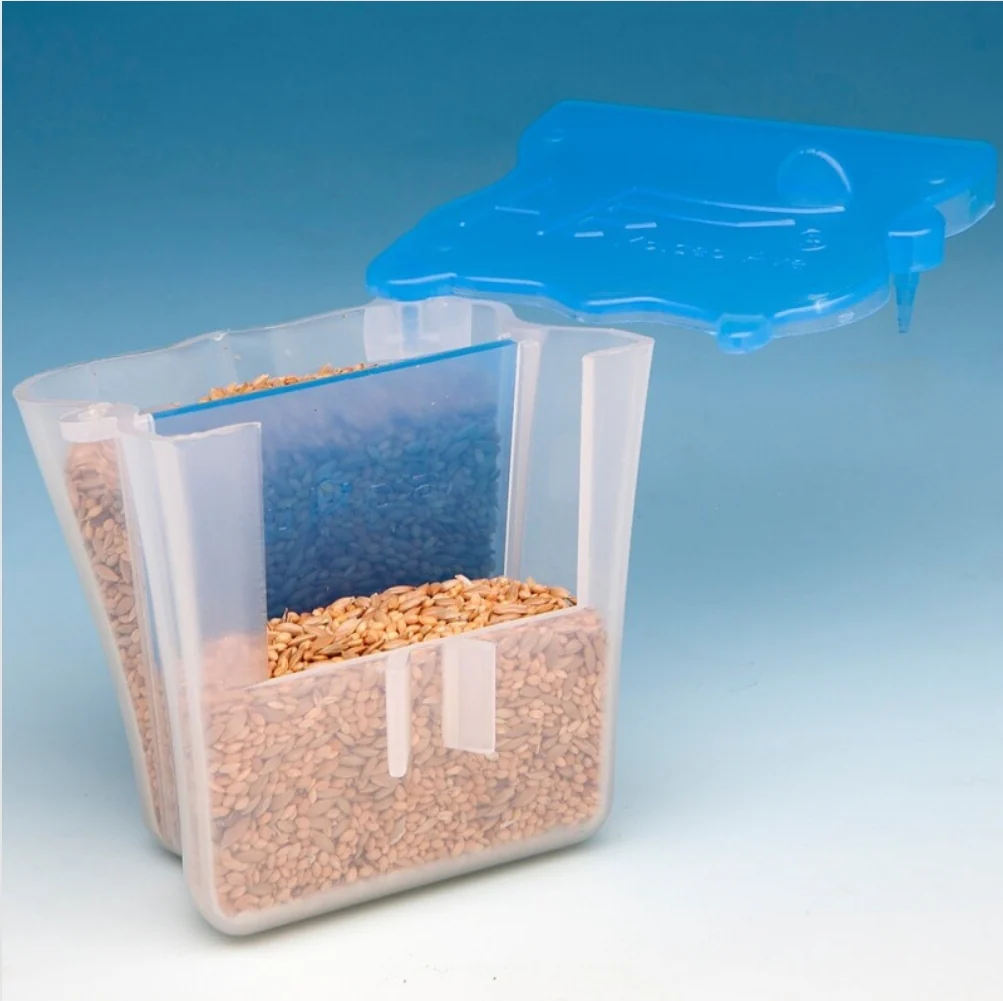 Mangiatoia Tulipa Linguetta coperchio blu. Perfetto per alimentatori a cappella. Grazie al separatore interno a tramoggia, abbiamo una capacità di alimentazione molto maggiore. Realizzato in polipropilene alimentare, un materiale resistente e flessibile. Dimensioni: 75 × 100xH85mm. Capacità : 90gr.