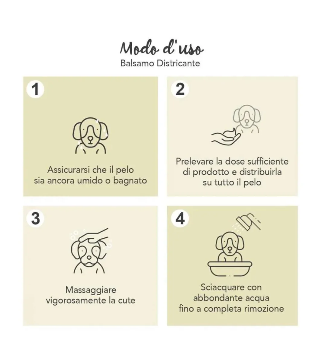 MODO D’USO: distribuire la dose sufficiente di prodotto sul pelo bagnato e precedentemente trattato con shampoo, massaggiare vigorosamente fino alla cute e sciacquare con abbondante acqua fino a completa rimozione.