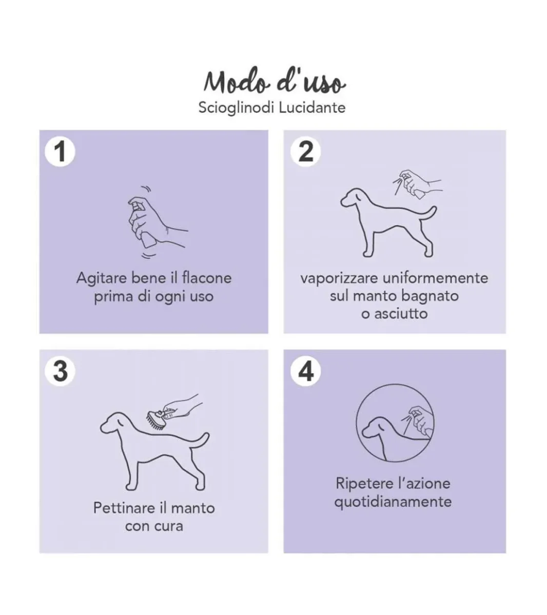 MODO D’USO: agitare il prodotto prima di ogni utilizzo, quindi vaporizzare uniformemente sul manto bagnato o asciutto, infine pettinare con cura. Per mantenere il manto lungo snodato ed in perfette condizioni applicare ogni giorno.