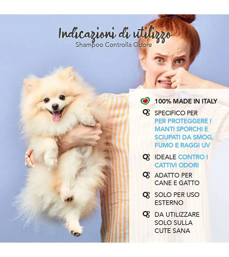 - shampoo per cani specifico per detergere e proteggere i manti sporchi e sciupati dallo smog, dal fumo e dai raggi UV e attivare un vero e proprio effetto controlla odore a lunga durata;