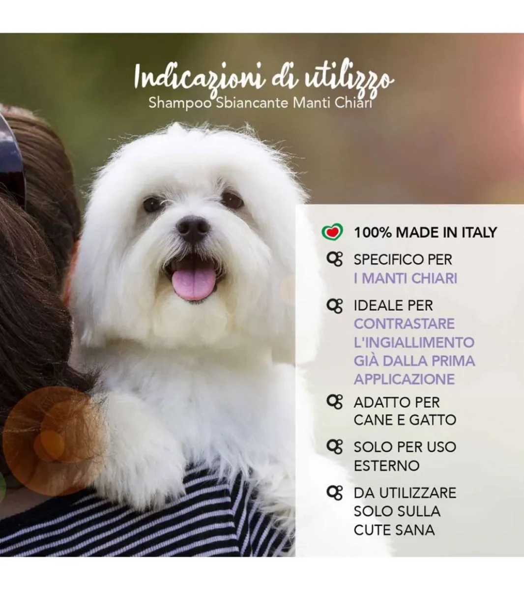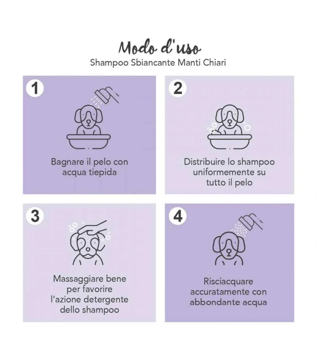 INDICAZIONI: ideale per tutte le razze. Non contiene decoloranti del pelo o acqua ossigenata schiarente. Solo per uso esterno. Da utilizzare solo sulla cute sana.