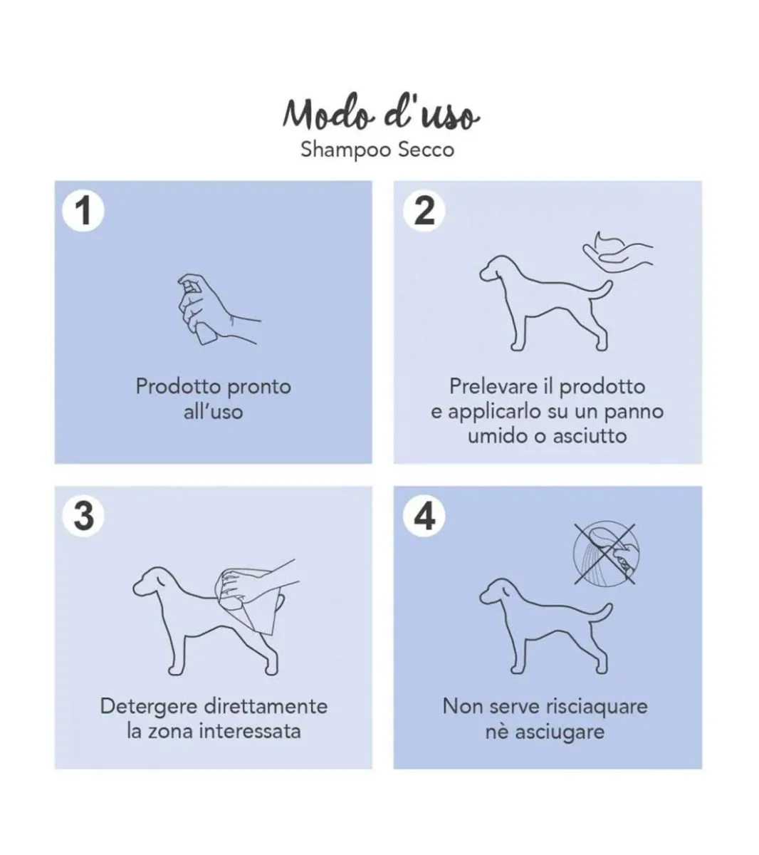 MODO D’USO: applicare il prodotto su un panno umido o asciutto, quindi detergere direttamente la zona desiderata (es. manto o zampe). Non serve risciacquare, nè asciugare.