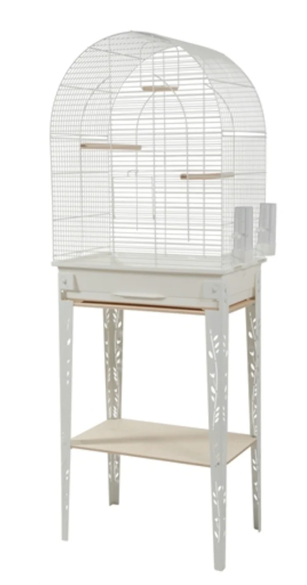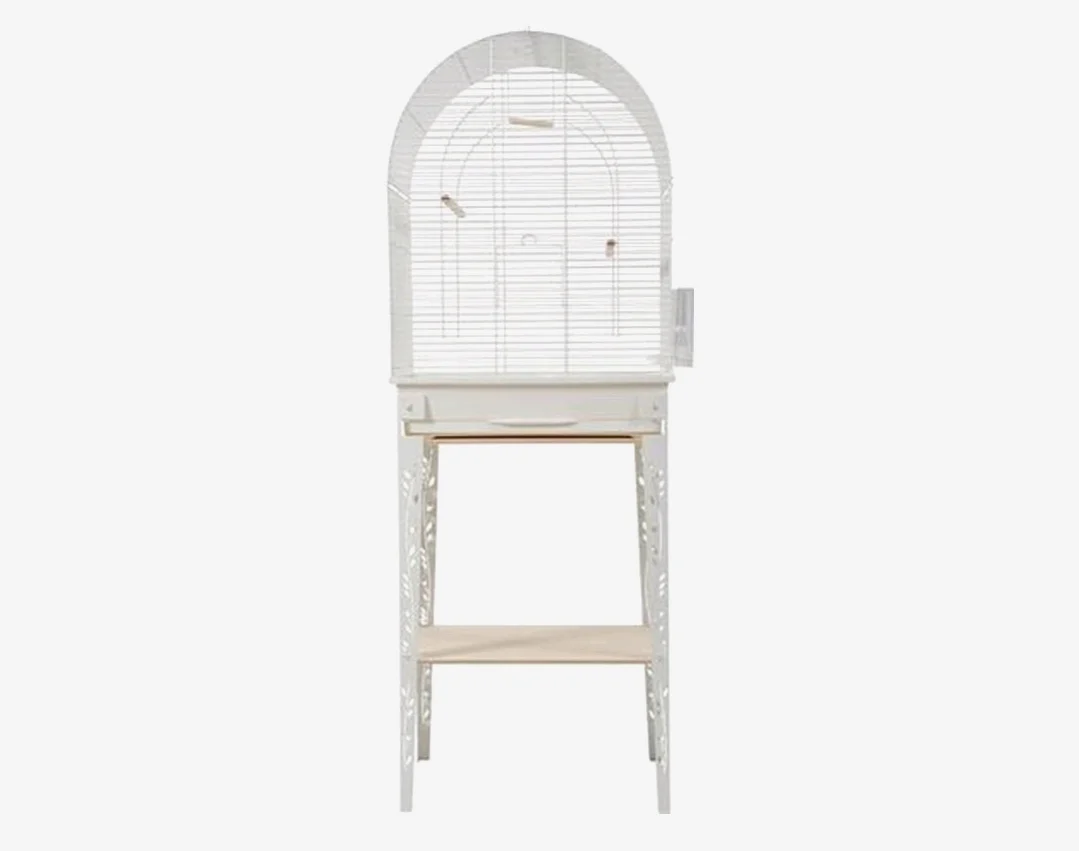 La Zolux Bird Cage Patio With Stand White 144 cm è una gabbia in metallo e legno per parrocchetti, canarini e altri esotici, in stile industriale, con cassetto, posatoi, altalena e ciotole per il cibo.